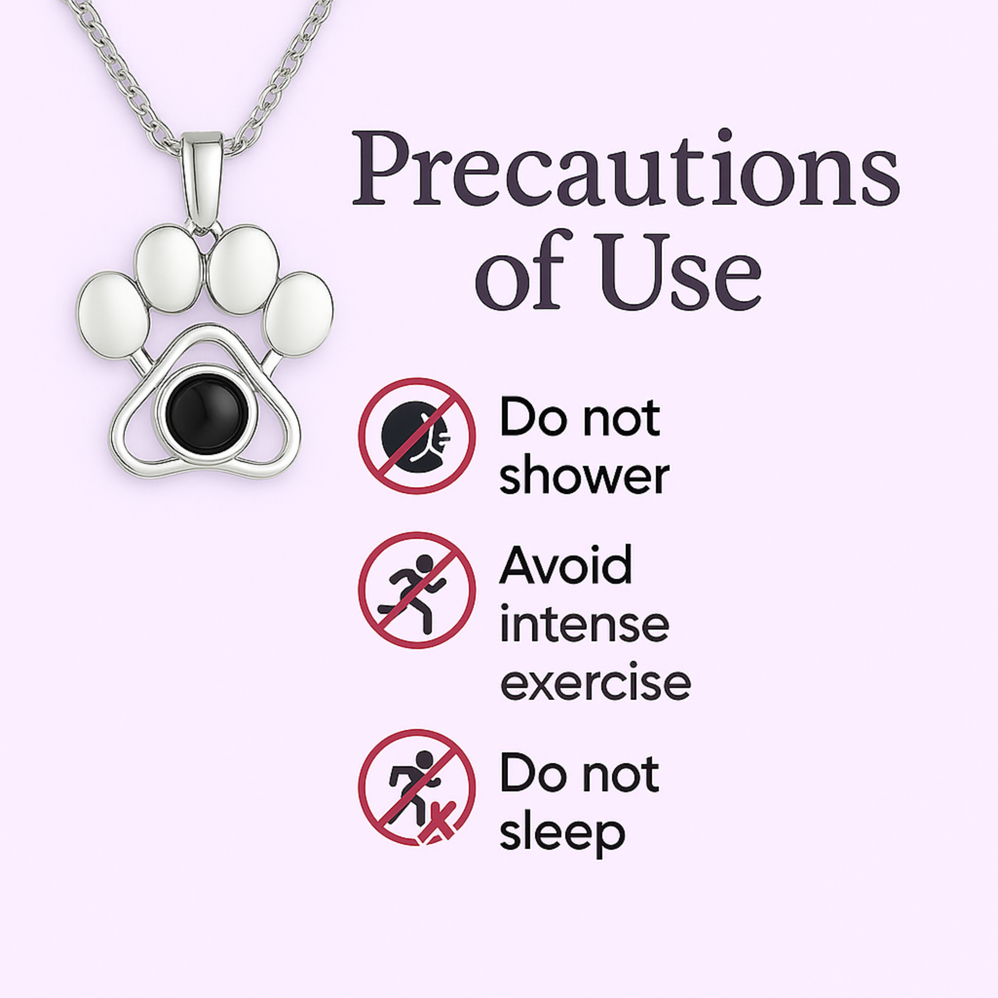 To keep your necklace shining, avoid contact with water, perfume, or sweat. Remove it before sleeping, showering, or exercising. Taking good care of it helps preserve both the metal and the photo projection.